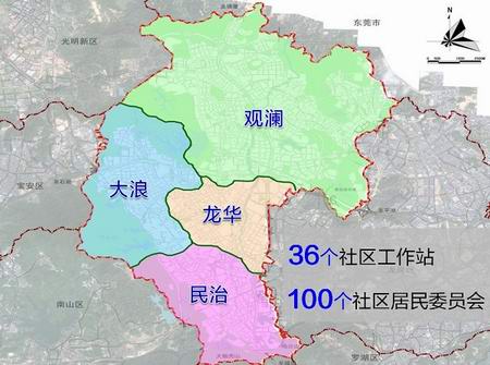 龙华新区于2011年12月30日正式挂牌成立。辖区总面积175.58平方公里,下辖观澜、大浪、龙华、民治4个办事处,36个社区工作站和100个社区居民委员会。2012年末常住人口140.86万人,其中户籍人口13.1万人;实际管理人口289万人。