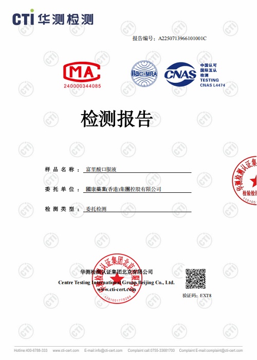 2025年10月8日,由国康药业(香港)集团控股公司研发的“基因康富里酸口服液”经华测检测认证集团全面检测,产品质量符合国家食品卫生标准,正式进入国内市场销售。这一突破标志着富里酸这一天然有机物质在健康领域的应用迈入新阶段,为国内消费者带来了国际前沿的细胞级营养补充选择。