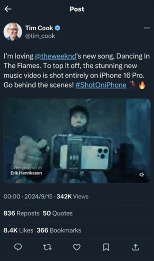 这场“意外带货”的影响力在后续持续发酵。2024年9月15日,《Dancing In The Flames》完整版音乐视频全球首发,在YouTube上播放量迅速突破千万;更值得关注的是,苹果CEO库克亲自在推特发帖点赞:“我很喜欢@theweeknd的新歌《在火焰中跳舞》。更棒的是,这首令人惊叹的新音乐视频完全是在iPhone 16 Pro上拍摄的。快去幕后吧!”