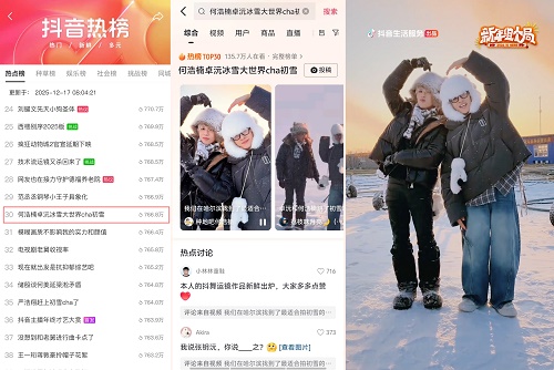 哈尔滨站则因为冰雪的浪漫与嘉宾的反差萌频频出圈。#何浩楠卓沅来了哈尔滨也要毛绒绒 横扫多榜。而“cha初雪”的经典场面,更是冲上抖音热点榜TOP30,被网友誉为“冬日偶像剧画面”。